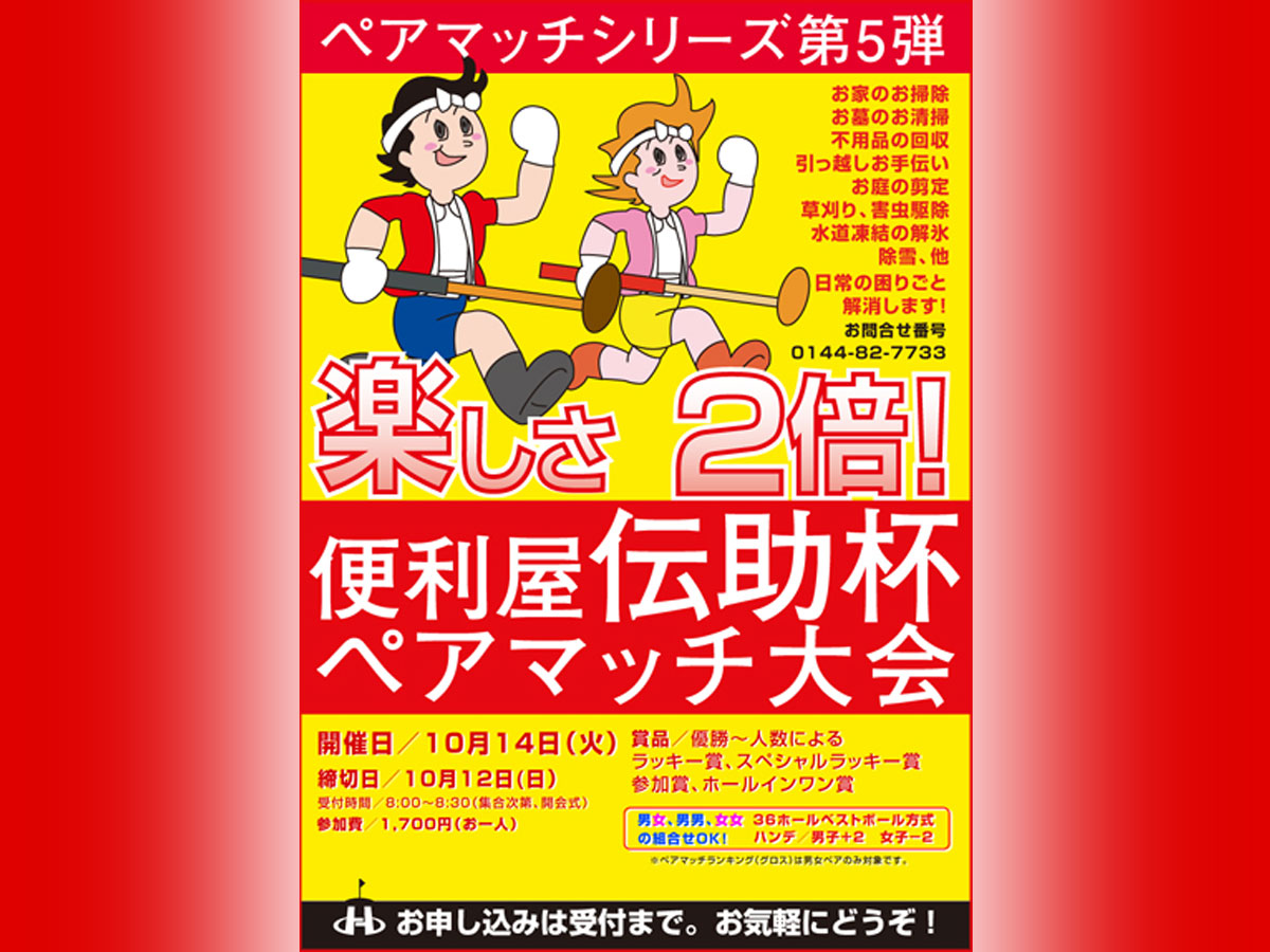 @10月14日、好天の下でペアシリーズ第5戦「便利屋伝助杯ペアマッチ大会」が男女48組96名の参加で開催されました。今大会は有限会社レアル様関連事業に冠協賛いただきました。